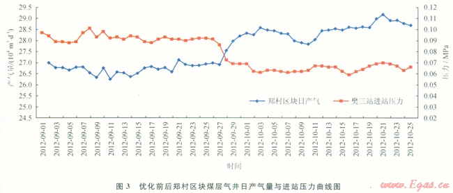 優(yōu)化調整后鄭村區(qū)塊煤層氣井日產氣量明顯上升,平均日增產氣量2.5×101 m”,集氣站進站壓力明顯下降,由0.09MPa降至0.06~0.07MPa(圖3)。