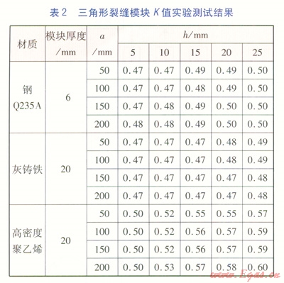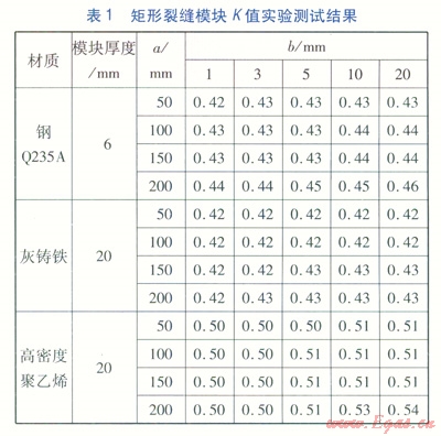 流量修正系數(shù)K的取值,主要取決于裂縫斷面形狀、管材。在實(shí)驗(yàn)室需制作相關(guān)模型分類測(cè)試計(jì)算。建立不同裂縫形狀及大小、不同板材及厚度的模塊,通過(guò)對(duì)各種模塊的測(cè)試分析計(jì)算,得出流量修正系數(shù)K的取值范圍。