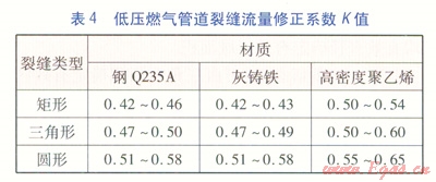 經(jīng)多次實(shí)驗(yàn)驗(yàn)證,在燃?xì)獾蛪汗鉅顩r下,改變?nèi)細(xì)獾膲毫?span lang="EN-US">(緩沖罐內(nèi)燃?xì)鈮毫?span lang="EN-US">),測(cè)試的K值不變,且K值受模塊壁厚影響甚微。由此得出管道裂縫流量修正系數(shù)K的取值范圍,見(jiàn)表4。