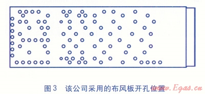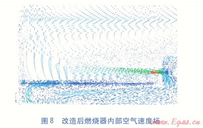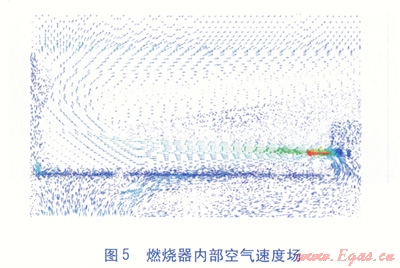 我們采取的優(yōu)化方案是在穩(wěn)壓室內(nèi)增設(shè)一個(gè)擋板,并對布風(fēng)板的開孔進(jìn)行重新布置。改造后的穩(wěn)壓室結(jié)構(gòu)及布風(fēng)板開孔位置分別見圖6、7。改造后,通過調(diào)節(jié)擋板位置可以獲得合理的一二次空氣量比例,保證一次空氣量能夠穩(wěn)定且不受燃燒過程的影響。二次風(fēng)由于處于一個(gè)楔形通道內(nèi),使得流動(dòng)更容易均勻,消除穩(wěn)壓室內(nèi)的渦旋氣流的產(chǎn)生。改造后燃燒器內(nèi)部空氣速度場見圖8。