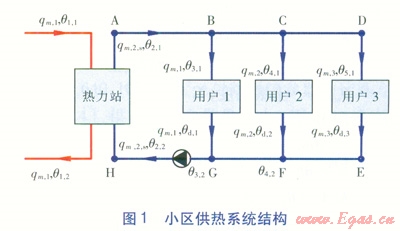 小區(qū)供熱系統(tǒng)結(jié)構(gòu)見(jiàn)圖l。小區(qū)供熱系統(tǒng)劃分為3個(gè)部分:熱力站、二級(jí)管網(wǎng)、用戶(hù)。