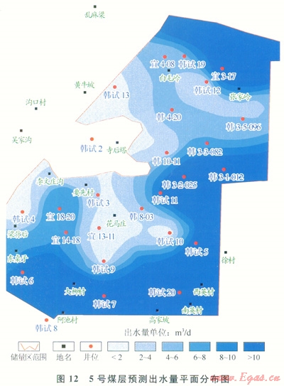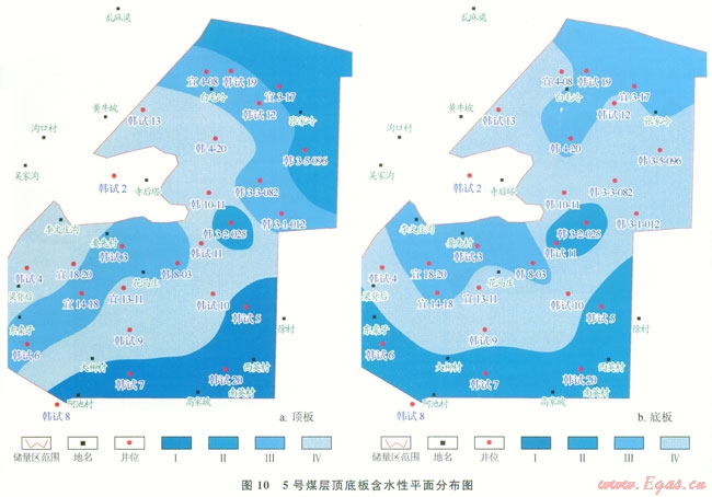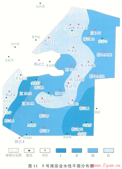 基于煤層自身產(chǎn)水量測井預(yù)測結(jié)果及上述劃分標(biāo)準(zhǔn),編繪了5號煤層含水性平面分布圖(圖11)。由圖11可知,5號煤東南部韓試5、韓試20井區(qū),及西南部宜18-20、韓試6井區(qū)含水性較強(qiáng),其他區(qū)域則相對較弱。