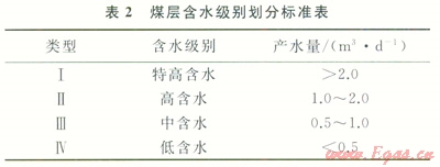 諸如上述煤層頂?shù)装搴墑e劃分方法,對研究區(qū)煤層含水級別進(jìn)行了劃分(表2)。