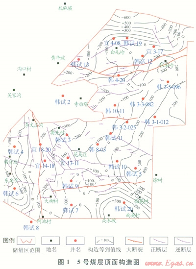 韓試20井位于構(gòu)造低幅度區(qū)(圖1),該井5號煤層頂?shù)装鍨楹駥幽鄮r,含水性較差,即使人工壓裂施工中將頂?shù)装鍓捍?,也不會增加出水量;且該井遠(yuǎn)離斷裂帶,表明斷裂對出水的影響不大。該井11號煤層的老頂為石灰?guī)r,該套石灰?guī)r可能成為一套富水性較好的巖溶含水層,盡管ll號煤層的直接頂板較厚,難以壓穿并溝通該套石灰?guī)r巖溶含水層。然而,處于高構(gòu)造部位的鄰井,如泥巖直接頂較薄,或該套石灰?guī)r巖溶含水層為直接頂,高部位的水將會沿著煤層割理流向構(gòu)造低部位的韓試20井。該井5號、ll號煤層壓裂排采初期日產(chǎn)水40m3,表明出水的主要原因在于該井位于構(gòu)造低幅度區(qū),高部位含水層中的地層水沿著煤巖割理流向低構(gòu)造幅度去的韓試20井,致使排采出水量增大。