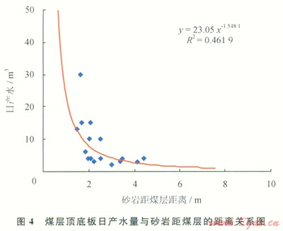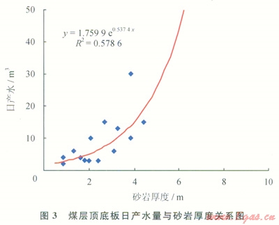 煤層直接頂?shù)装鍨樯皫r時,物性較好,且砂巖厚度越大,則頂?shù)装迳皫r的含水性越強(qiáng),煤層壓裂后頂?shù)装迳皫r的地層水易于產(chǎn)出,排采出水量亦較大。如果砂巖為老頂?shù)?,但直接頂?shù)装宓哪鄮r較薄,壓裂時容易壓穿直接頂?shù)装宓哪鄮r,致使壓裂縫溝通了老頂?shù)椎纳皫r而增大出水量,且隨著砂巖距煤層越近,越易于壓穿直接頂而溝通砂巖含水層,為此,頂?shù)装迳皫r的厚度、孔隙度及距煤層的距離與煤層排采出水量有較大的關(guān)系。