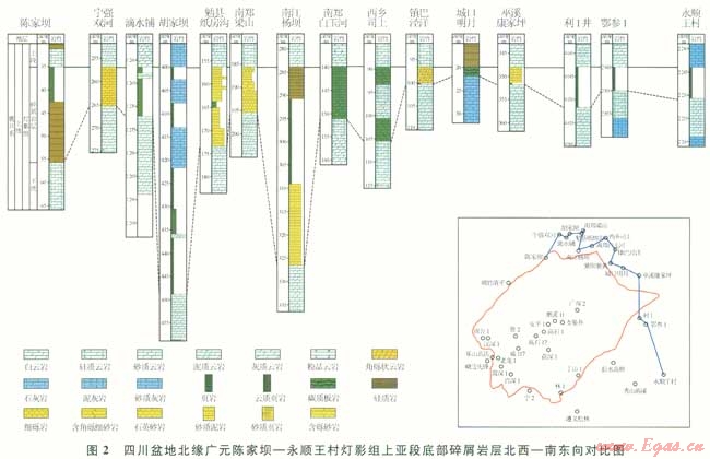 盆地北緣川北、陜南地區(qū)大致以漢南古陸為中心向其周緣,“碎屑巖層”由濱岸相石英砂巖相變?yōu)殛懪锵嗟纳百|(zhì)泥巖、盆地相的黑色頁巖與硅質(zhì)巖。緊鄰漢南古陸的南鄭縣梁山鎮(zhèn)地區(qū)以石英砂巖為主,自漢南古陸向西側,勉縣紙房溝為石英砂巖夾砂質(zhì)泥巖,寧強縣胡家壩鎮(zhèn)地區(qū)為藍灰—紫紅色頁巖、泥質(zhì)云巖、黑灰色頁巖夾石英砂巖,寧強縣滴水鋪鄉(xiāng)地區(qū)為灰綠色砂質(zhì)頁巖,寧強縣雙河鄉(xiāng)地區(qū)為藍灰色砂質(zhì)云巖,廣元陳家壩相變?yōu)樯百|(zhì)頁巖,再往西到青川關莊等地則遭受剝蝕而缺失該套地層;自漢南古陸向東側,南江楊壩為石英砂巖與深灰色泥巖,南鄭白玉河、西鄉(xiāng)司上為含泥質(zhì)云巖,鎮(zhèn)巴涇洋為次生角礫云巖(圖2)。