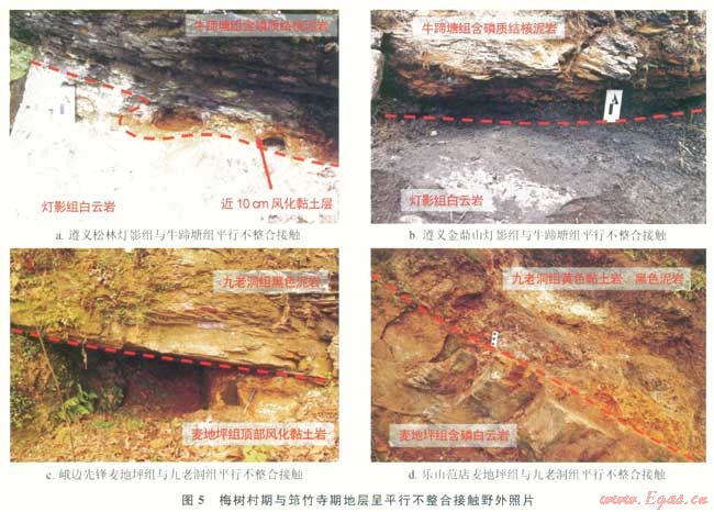 黔北遵義松林、金鼎山地區(qū)梅樹村組與燈影組上亞段幾乎均被剝蝕,牛蹄塘組與燈影組下亞段直接接觸,接觸面凹凸不平,松林地區(qū)見厚約10cm的風化黏土層;川西南峨邊先鋒、樂山范店九老洞組底部見鐵質(zhì)風化黏土層,與麥地坪組呈平行不整合接觸(圖5);川北米倉山福成剖面寬川鋪組厚20cm石灰?guī)r頂面凹凸不平,其上部與郭家壩組黑色頁巖呈平行不整合接觸[21]。