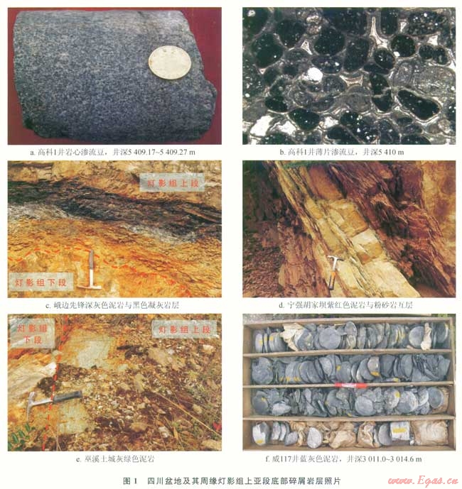 該期抬升運動發(fā)生于燈影組下亞段沉積后,上揚子地臺發(fā)生整體強烈抬升,具有兩個方面的響應特征:①抬升運動使燈影組下亞段微生物白云巖露出水面遭受大氣淡水溶蝕而發(fā)育溶蝕孔洞、滲流豆、鈣結殼、古風化殘積礫屑云巖、巖溶角礫巖等。滲流豆石層的頂面是一個比較截然的界面,或者說是一個暴露面或間斷面,滲流豆的出現(xiàn)反映其形成時處于陸上暴露的環(huán)境[18]。高科l井在井深5409~5410m發(fā)育明顯的滲流豆(圖1-a、1-b)。②燈影組下亞段抬升風化剝蝕后,地殼發(fā)生強烈伸展作用[19],上揚子地臺重新開始接受海侵沉積,沉積物主要為藍灰色泥巖、黑色頁巖、紫紅色泥巖、砂巖、泥質(zhì)云巖與硅質(zhì)巖,厚數(shù)十厘米至數(shù)十米不等。該“碎屑巖層”與燈影組下亞段呈平行不整合接觸,接觸面凹凸不平(圖1-c、l-f)。