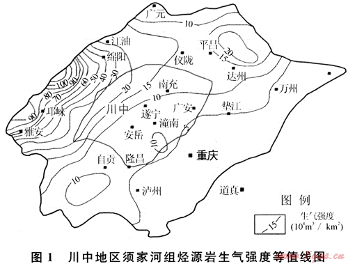 川中地區(qū)須家河組為一套自生自儲的氣藏,須一段、須三段、須五段暗色泥巖層夾煤層是主要烴源巖,源巖中有機質(zhì)極為豐富,具有形成大氣田的物質(zhì)基礎(chǔ);烴源巖厚度較大,暗色泥質(zhì)源巖厚度超過100m;烴源巖總厚度一般超過130m,局部地區(qū)大于300m,煤巖總厚度超過3m,具多層分布的特點,部分井可達數(shù)層,煤巖單層厚度為0.2~1m;烴源巖有機碳豐度普遍較高,平均為1.76%,以腐殖型干酪根為主,川中地區(qū)發(fā)育最好的3套烴源以須五段最好,須三段次之,須一段厚度較薄。盡管川中地區(qū)每套烴源巖生氣強度偏低,平均生氣強度為12.1×108m3/km2(圖1),但其烴源巖厚度較大、有機質(zhì)含量高、分布范圍大、構(gòu)造平緩、中深埋藏、保存條件良好,為須二、須四、須六段天然氣富集成藏提供了豐富的物質(zhì)基礎(chǔ),具備形成大中型氣藏的氣源條件。