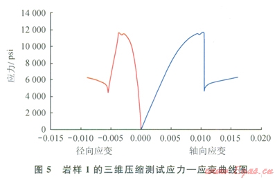 三維壓縮實(shí)驗(yàn)應(yīng)力 應(yīng)變曲線如圖5、6所示。巖石材料的塑性與脆性可根據(jù)應(yīng)力、應(yīng)變曲線上負(fù)坡的坡降大小來劃分。負(fù)坡較陡者為脆性,反之為塑性。由圖5、6可知:巖樣1和巖樣2在應(yīng)力分別為l2000psi(1psi=6.895kPa)和20000psi時(shí),應(yīng)變?yōu)?span lang="EN-US">0.01、0.009時(shí)破碎,屬于脆性巖石,且?guī)r樣2應(yīng)力、應(yīng)變曲線上的負(fù)坡較陡,故其脆性優(yōu)于巖樣1。