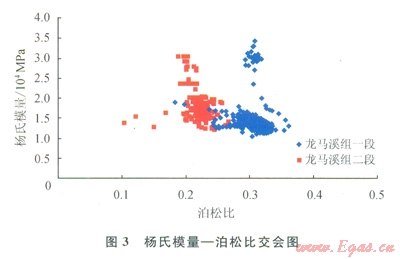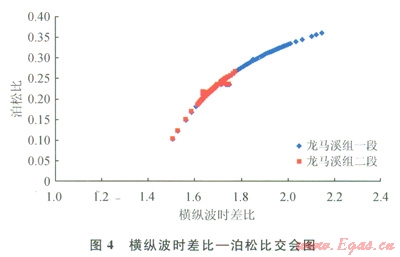 整體龍馬溪組楊氏模量介于l×104~3.5×104MPa,平均為2.3×104MPa;泊松比介于0.1~0.37,平均為0.24。通過圖3可以看出,龍馬溪組一段楊氏模量平均值為1.4×104MPa,泊松比平均值為0.3;龍馬溪組二段楊氏模量平均值為l.8×104MPa,泊松比平均值為0.23。龍馬溪組二段較龍馬溪組一段具有低泊松比,高楊氏模量,說明其脆性優(yōu)于一段。圖4為橫縱波時(shí)差比和泊松比的交會圖,可以看出龍馬溪組二段的橫縱波時(shí)差比明顯低于一段,說明低橫縱波時(shí)差比參數(shù)用于表征頁巖的脆性程度是有效的。