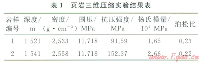 通過巖石力學(xué)實(shí)驗(yàn),龍馬溪組二段頁巖儲層基質(zhì)巖石,抗壓強(qiáng)度分布在91~152MPa,平均抗壓強(qiáng)度為121.98MPa,平均楊氏模量為2.15×104MPa,平均泊松比為0.23(表1)。測試數(shù)據(jù)分析結(jié)果可知,巖樣2對比巖樣l具有低泊松比和高楊氏模量的特征,說明龍馬溪組二段在深度1541m時(shí),頁巖脆性程度最優(yōu),與先前的礦物分析和脆性指數(shù)得到的結(jié)論相符。