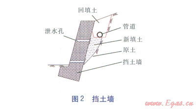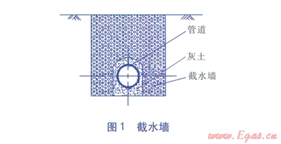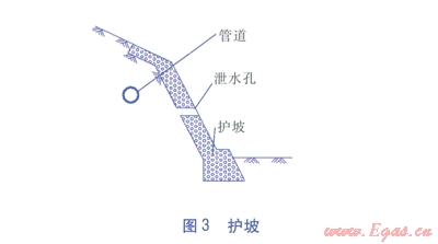 a.如果地貌允許(如荒地),首先進(jìn)行分階削方處理,使管道通過處的坡度≤30°;其次在有可能產(chǎn)生積水或高跌水的位置,考慮設(shè)置漿砌塊石截水墻(見圖l)、排水溝,將水疏導(dǎo)至遠(yuǎn)離管道的地方,避免出現(xiàn)漏斗、溶洞以及對管溝產(chǎn)生沖蝕。
