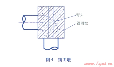 c.無論按照上述a或b哪種情況處理后,都還需要根據(jù)坡長及管徑設(shè)置錨固墩(見圖4),一般坡長>25m時(shí),坡腳用素混凝土或灰土墩將彎頭錨固,坡長>35m時(shí),除下部彎頭錨固以外,陡坡上每隔15~20m采用錨桿固定,錨桿深度應(yīng)在原土或基巖中。