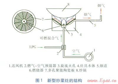 新型炒菜灶主要工作原理為:空氣通過送風(fēng)機經(jīng)空氣管道進(jìn)入燃?xì)?/span>—空氣預(yù)混器,LPG通過開設(shè)在預(yù)混器側(cè)壁上的小孔高速噴入與空氣初步混合。LPG與空氣再經(jīng)旋流火孔噴出后進(jìn)一步混合,使得可燃混合氣成一定角度旋流強烈燃燒,使得鍋底與火焰的接觸面積增大。高溫?zé)煔馔ㄟ^多孔聚能陶瓷板上的環(huán)形孔后排入煙道,陶瓷板積蓄了大量的煙氣余熱,可對鍋底進(jìn)行二次輻射加熱,實現(xiàn)了高溫?zé)煔獾挠酂峄厥绽谩?/span>