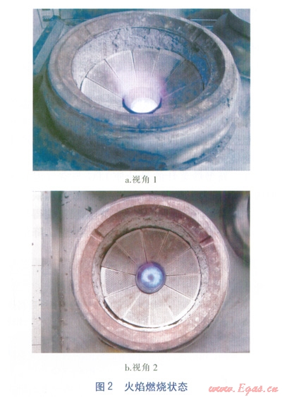 新型炒菜灶的結(jié)構(gòu)見圖1,火焰燃燒狀態(tài)見圖2。主要由燃?xì)庖豢諝忸A(yù)混器、灶具本體、燃燒器、扇形多孔聚能陶瓷板、送風(fēng)機等組成。燃燒器的內(nèi)壁開有能使可燃混合氣旋流噴出的旋流火孔,方向為軸向順時針傾斜15°并且切向傾斜向上15°,孔徑為2.5mm。