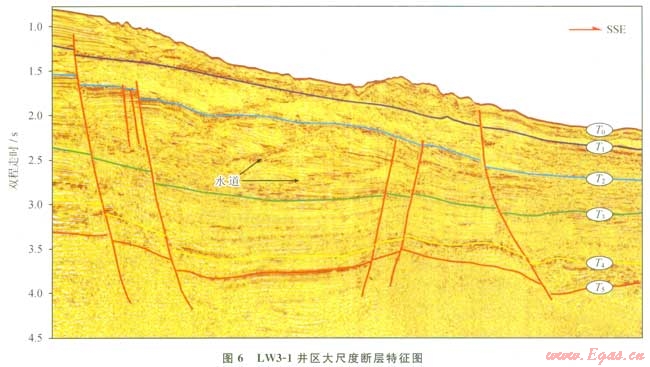 同時,在LW3-1井區(qū)北部和西部發(fā)育了若干條大尺度斷層,平面上呈平行的近W—E向展布(圖3),這些斷層發(fā)育于深部的漸新統(tǒng),至上新世和更新世仍在活動(圖6)。大尺度斷層的發(fā)育使得LW3-1井區(qū)的地層表現(xiàn)為地塹/地壘的特征(圖6)。由于大尺度斷層溝通了深部的烴源巖系,可以作為下部烴源巖向上運移的重要疏導(dǎo)體系。通過區(qū)域上含氣層位同位素和流體包裹體的分析,也證實了大尺度斷層作為運移通道的有效性[22]。