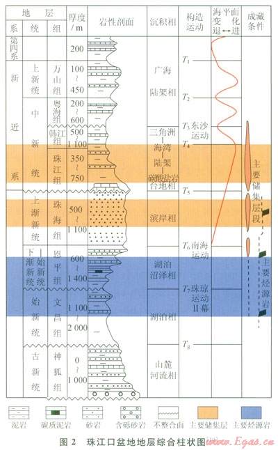 珠江口盆地是位于南海北部大陸架上的中、新生代沉積盆地。盆地呈NE方向展布,具有“三隆兩坳”的構(gòu)造格局,從北至南依次為北部斷階帶、北部坳陷帶、中央隆起帶、南部坳陷帶和南部隆起帶等5個一級構(gòu)造單元[7]。神狐水合物鉆探區(qū)和LW3-1井區(qū)均位于白云凹陷南側(cè)(圖1)。以區(qū)域“破裂不整合面——T7,界面”為界,珠江口盆地的構(gòu)造演化可劃分為兩個階段:斷裂階段和裂后階段[8]。同樣以T7界面為界,盆地垂向上構(gòu)成了下斷上坳的雙層結(jié)構(gòu)和先陸后海的沉積組合[9]。整個盆地的沉積充填為古新統(tǒng)—下統(tǒng)新統(tǒng)的沉積地層(包括神狐組、文昌組和恩平組),以及古新統(tǒng)—下漸新統(tǒng)的沉積地層(珠海組、珠江組、韓江組、粵海組和萬山組)。沉積環(huán)境也發(fā)生了由陸向海、水向深水、由過補(bǔ)償向欠補(bǔ)償?shù)难葑?/span>(圖2)。