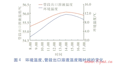 其他條件不變,采用長(zhǎng)沙典型年1月1日8:00—17:00的逐時(shí)室外干球溫度作為環(huán)境溫度,對(duì)管段0-4出口溶液溫度進(jìn)行仿真計(jì)算。環(huán)境溫度、管段出Vl溶液溫度隨時(shí)間的變化見(jiàn)圖4。由圖4可知,計(jì)算工況下,環(huán)境溫度從最低(1.5℃)升至最高(11.5℃),管段0-4出口溶液溫度由55.27℃升至56.07℃。