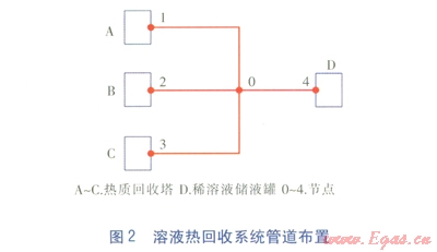 某溶液熱回收系統(tǒng)管道布置見(jiàn)圖2,溶液分別從熱質(zhì)回收塔A、B、C吸收熱量后在節(jié)點(diǎn)0匯合,進(jìn)入稀溶液儲(chǔ)液罐D。
