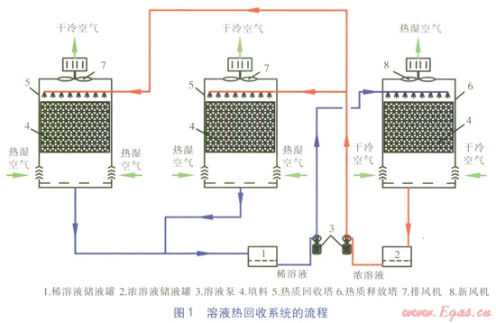溶液熱回收系統(tǒng)是一種基于大量溶液循環(huán)的新型能量回收系統(tǒng),適用于空氣、煙氣及蒸汽等的能量回收,并可實(shí)現(xiàn)多點(diǎn)能量的綜合回收利用與轉(zhuǎn)化,是一種環(huán)保高效的新型節(jié)能技術(shù)。溶液熱回收系統(tǒng)是回收建筑物內(nèi)(外)的余熱(冷)或廢熱(冷),并把回收的熱(冷)量用于供熱(冷)或作為其他設(shè)備的冷(熱)源加以利用的系統(tǒng)。溶液熱回收系統(tǒng)(流程見(jiàn)圖l)主要設(shè)備包括熱質(zhì)回收塔、熱質(zhì)釋放塔、風(fēng)機(jī)、溶液泵及儲(chǔ)液罐等。大量的熱濕空氣從熱質(zhì)回收塔底部進(jìn)入,與低溫濃溶液在填料表面接觸,進(jìn)行熱濕交換,熱濕空氣變?yōu)楦衫淇諝?,低溫濃溶液則變?yōu)楦邷叵∪芤?,并收集到稀溶液?chǔ)液罐。熱質(zhì)釋放塔用于溶液再生,干冷空氣從塔下部進(jìn)入,與來(lái)自稀溶液儲(chǔ)液罐的高溫稀溶液在填料表面接觸,進(jìn)行熱質(zhì)交換后變?yōu)闊釢窨諝?。高溫稀溶液則變?yōu)榈蜏貪馊芤?,并收集到濃溶液?chǔ)液罐。對(duì)于處理量較大的場(chǎng)所,可并聯(lián)若干臺(tái)熱質(zhì)回收、釋放塔。