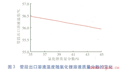 氯化鋰溶液的常用質(zhì)量分?jǐn)?shù)范圍為35%~45%,以管段1-0為例,當(dāng)其他條件不變時(shí),管段出口溶液溫度隨氯化鋰溶液質(zhì)量分?jǐn)?shù)的變化見(jiàn)圖3。由圖3可知,在計(jì)算工況下,氯化鋰溶液質(zhì)量分?jǐn)?shù)越高,溶液溫降越大。