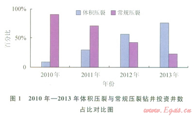 2010年—2013年中國石油西南油氣田公司蜀南氣礦(以下簡稱蜀南氣礦)在四川盆地川南地區(qū)加砂壓裂累計完成77口井:其中體積壓裂38口井(須加河組砂巖24口井、龍馬溪組頁巖氣14口井),占比49.35%;常規(guī)壓裂39口井,占比50.65%。在此期間,2010年加砂壓裂11口井:其中體積壓裂1口井,占比9.09%,常規(guī)壓裂10口井,占比90.91%;2011年加砂壓裂17口井:其中體積壓裂5口井,占比29.41%,常規(guī)壓裂12口井,占比70.59%;2012年加砂壓裂28口井:其中體積壓裂16口井,占比57.14%,常規(guī)壓裂12口井,占比42.86%;2013年加砂壓裂21口井:其中體積壓裂16口井,占比76.19%,常規(guī)壓裂5口井,占比23.81%,由此可見,在4年中,體積壓裂井?dāng)?shù)占比呈明顯上升趨勢(圖1)。
