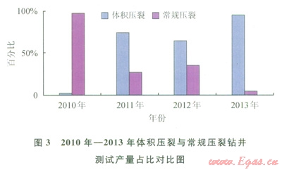 2010年—2013年蜀南氣礦在川南地區(qū)加砂壓裂鉆井累計測試產(chǎn)量732.49×104m3/d:其中體積壓裂獲取測試產(chǎn)量497.63×104m3/d,占比67.94%,常規(guī)壓裂獲取測試產(chǎn)量234.86×104m3/d,占比32.06%。在此期間,2010年測試產(chǎn)量39.82×104m3/d:其中體積壓裂1.08×104m3/d,占比2.79%,常規(guī)壓裂38.74×104m3/d,占比97.21%;2011年測試產(chǎn)量48.24×104m3/d:其中體積壓裂35.41×104m3/d,占比73.4%,常規(guī)壓裂12.83×104m3/d,占比26.6%;2012年測試產(chǎn)量498.89×104m3/d:其中體積壓裂322.52×104m3/d,占比64.65%,常規(guī)壓裂176.37×104m3/d,占比35.35%;2013年測試產(chǎn)量145.54×104m3/d:其中體積壓裂138.62×104m3/d,占比95.25%,常規(guī)壓裂6.92×104m3/d,占比4.75%,體積壓裂測試產(chǎn)量占比呈上升趨勢(圖3)。