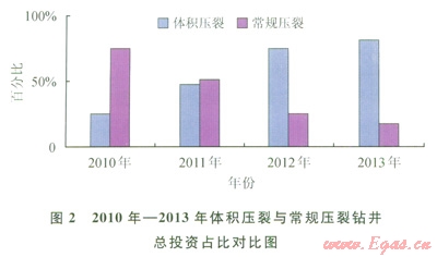 2010年—2013年蜀南氣礦在川南地區(qū)加砂壓裂鉆井累計投資267623萬元:其中體積壓裂179231萬元、占比66.97%,常規(guī)壓裂88392萬元、占比33.03%。在此期間,2010年加砂壓裂投資21311萬元:其中體積壓裂5386萬元,占比25.25%,常規(guī)壓裂15925萬元,占比74.75%;2011年加砂壓裂投資59344萬元:其中體積壓裂28608萬元,占比48.21%,常規(guī)壓裂30736萬元,占比51.79%;2012年投資107910萬元:其中體積壓裂80645萬元,占比74.73%,常規(guī)壓裂27265萬元,占比25.27%;2013年投資79058萬元:其中體積壓裂64592,占比81.7%,常規(guī)壓裂14466萬元,占比18.3%,體積壓裂投資占比呈逐漸上升趨勢(圖2)。