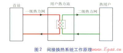 圖2中,一級熱力管網(wǎng)的高溫水和二級熱力管網(wǎng)的低溫水在用戶熱力站經(jīng)過換熱器間接換熱后供給熱用戶。而混水系統(tǒng)中(見圖l),一級熱力管網(wǎng)的高溫水和二級熱力管網(wǎng)的低溫水在用戶熱力站不經(jīng)過換熱器,而是直接混合后供給熱用戶。與間接換熱系統(tǒng)相比,混水系統(tǒng)更容易因為水溫的突然升高而產(chǎn)生氣體。