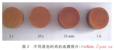 將人造巖心放入濃度為300kg/m3的成膜液中(80℃)浸泡5s、10s、10min和1h,分別取出后干燥,觀察成膜情況,不同浸泡時(shí)間成膜液的成膜情況如圖2。