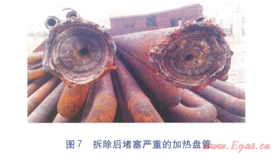 3臺摻水加熱爐于2012年10月陸續(xù)改造完成,并同期投產(chǎn)運行。改造后的3臺加熱爐運行情況基本平穩(wěn),直至2013年3月才陸續(xù)出現(xiàn)換熱效率低的現(xiàn)象。原加熱盤管基本兩個月就需要酸洗一次,酸液對金屬的腐蝕性強,易揮發(fā)產(chǎn)生酸霧污染原油,降低管道及設備的使用壽命[1]。而且隨著運行時間的延長,酸洗的次數(shù)增加,加熱盤管內(nèi)壁結垢傾向越來越嚴重,酸洗也變得無能為力。而改造后的浮頭換熱器能夠通過機械通洗繼續(xù)使用,清洗周期也比原加熱盤管有所延長。拆除后堵塞嚴重的加熱盤管見圖7,運行5個月的浮頭式換熱器換熱管端面見圖8。實踐充分證明,采用浮頭式換熱器替代蛇形加熱盤管,內(nèi)壁涂覆防垢涂層并提高摻水流速,有效地延緩了清洗時間。浮頭式換熱器可抽出,方便清洗,確保了原油正常生產(chǎn)。