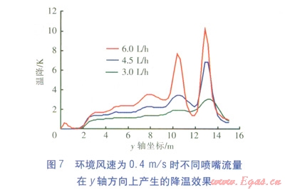 在環(huán)境風(fēng)速為0.4m/s,噴霧壓力為6MPa的條件下,增加單個噴嘴的流量進行模擬,對比3種噴嘴流量(3.0、4.5、6.0L/h)下,x=4m截面上。z=1.5m處在y軸方向上產(chǎn)生的降溫效果,見圖7。