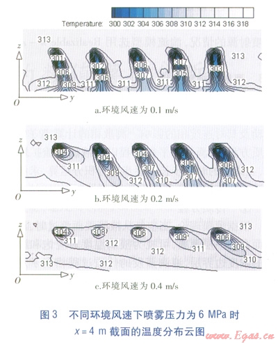 模擬結(jié)果顯示,在相同環(huán)境風(fēng)速下,3種噴霧壓力的降溫范圍與降溫幅度沒有明顯差別,說明在模擬的噴霧壓力范圍內(nèi),噴霧壓力對降溫效果的影響很小,不如環(huán)境風(fēng)速對降溫效果的影響明顯。