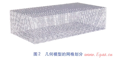 本文討論室外開敞空間應(yīng)用噴霧降溫的情況。室外開敞空間噴霧降溫的幾何模型長×寬×高為15m×8m×4m,見圖1。模擬地點為重慶市,夏季連晴高溫天氣期間,建筑密集區(qū)等局部地區(qū)最高室外溫度常達(dá)40~44℃,給人們生產(chǎn)、生活造成影響。因此,參考夏季連晴高溫天氣期間的氣象條件,設(shè)置數(shù)值模擬的初始條件為:室外空氣溫度為40℃,相對濕度為26%;地面設(shè)置為壁面,溫度為47℃;空氣入口為速度入口,環(huán)境風(fēng)速分別設(shè)為0.1、0.2、0.4m/s,流動方向為y軸正方向;兩側(cè)面為壓力入口,上表面及空氣出口為壓力出口。網(wǎng)格劃分采用規(guī)則的六面體網(wǎng)格形式,網(wǎng)格數(shù)6×104個,見圖2。
