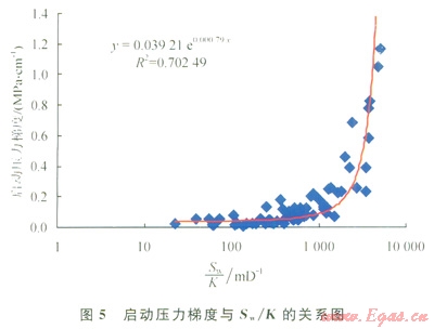 巖石孔隙介質(zhì)中,由于氣水潤(rùn)濕性的差異和毛細(xì)管壓力的作用,水優(yōu)先占據(jù)小孔喉和孔隙壁面,并且由于氣體的易壓縮性,其在含水的孔隙中流動(dòng)時(shí),首先選擇大的孔隙,隨著流動(dòng)壓差的增大,逐漸驅(qū)動(dòng)小一些吼道的水或使孔隙壁面的水膜變薄,在未形成連續(xù)氣流的孔喉處氣體前沿呈跳躍式前行,且容易被水卡斷[17],這就是氣體在含水孔隙介質(zhì)中流動(dòng)存在啟動(dòng)壓力梯度的微觀機(jī)理。表現(xiàn)在滲流曲線(xiàn)上,流量與壓差并不呈線(xiàn)性關(guān)系,通過(guò)數(shù)據(jù)擬合可以求出不同含水飽和度時(shí)的啟動(dòng)壓力,除以巖樣長(zhǎng)度即為啟動(dòng)壓力梯度,將全部巖樣的實(shí)驗(yàn)數(shù)據(jù)繪于同一圖上(圖4),發(fā)現(xiàn)啟動(dòng)壓力梯度隨含水飽和度增大而增大,且?guī)r樣滲透率越小,這種趨勢(shì)越明顯,當(dāng)含水飽和度大于50%以后,啟動(dòng)壓力梯度明顯增大。進(jìn)一步通過(guò)數(shù)據(jù)分析發(fā)現(xiàn),啟動(dòng)壓力梯度與含水飽和度和滲透率的比值(Sw/K)具有很好的相關(guān)性(圖5),呈以下的指數(shù)函數(shù)關(guān)系: