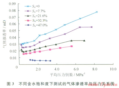前人研究表明[14-16],致密砂巖中由于復(fù)雜的孔隙結(jié)構(gòu),氣體滲流存在非達(dá)西特征。筆者通過(guò)氣驅(qū)水實(shí)驗(yàn)分析表明,當(dāng)驅(qū)替壓差較小時(shí),氣體不能驅(qū)動(dòng)水形成流動(dòng),只有當(dāng)驅(qū)替壓差大于某一臨界值,足以克服水鎖產(chǎn)生的毛細(xì)管阻力才能發(fā)生流動(dòng),這在滲流曲線(xiàn)上表現(xiàn)為啟動(dòng)壓差。對(duì)同一巖樣,其含水飽和度越高,氣體始流動(dòng)所需的驅(qū)動(dòng)壓差越大,氣體開(kāi)始流動(dòng)后,驅(qū)替壓差越大流量越大;巖樣含水飽和度越低,相同驅(qū)替壓差下流量越大。但是,壓差增大滲透率不一定變大,當(dāng)巖樣含水飽和度較高時(shí),隨著驅(qū)替壓差的增大(平均壓力倒數(shù)減小),氣體滲透率有的增加,有的減??;當(dāng)巖樣含水飽和度較低時(shí),隨著驅(qū)替壓差的增大(平均壓力倒數(shù)減小),氣體滲透率普遍呈先降低后增加的特點(diǎn),這是因?yàn)榍捌谥饕芑撔?yīng)的影響,而后期,當(dāng)平均壓力倒數(shù)低于一定程度后(即驅(qū)替壓差大于一定值后),這時(shí)氣體帶動(dòng)部分孔隙中的水流動(dòng),或使孔隙壁的水膜變薄,氣體滲流通道增加。因此氣體滲透率開(kāi)始增加(圖3)。含水飽和度越高,這種水的可動(dòng)性對(duì)氣體滲流的影響越明顯。