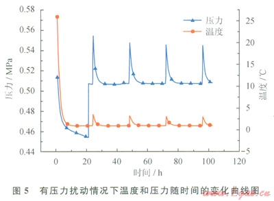 圖4、5分別表示在無壓力擾動(dòng)和有壓力擾動(dòng)下,靜態(tài)純水體系中C3H8水合物生成過程中溫度和壓力隨時(shí)間的變化曲線。溫度曲線表示C3H8水合物生成過程中溫度隨時(shí)間變化的曲線,而壓力曲線表示水合物生成過程中體系壓力隨時(shí)間變化的曲線。