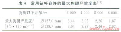 針對以上分析,根據(jù)常用的Æ127.0mm和Æ139.7mm鉆具曲線圖,反算出常用的鉆桿容許的最大井眼曲率如表4,可在現(xiàn)場使用參考。以此表格對比發(fā)生失效的4口井的情況(表2),可知其造斜點處的狗腿度均超過了容許限度,茍西003-Hl更是達到了6.24°/30m。