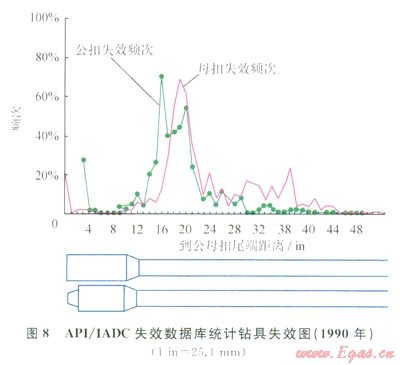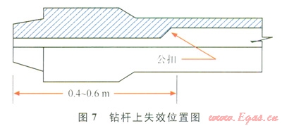 至于這種失效為什么往往發(fā)生在母扣接頭以下0.4~0.6m處,且剛好處于鉆具的加厚帶區(qū)域。追溯鉆桿生產(chǎn)工藝[10]便知:管體材質(zhì)、接頭和焊縫均已不是現(xiàn)代鉆桿生產(chǎn)的瓶頸,加厚帶及其附近位置已變?yōu)殂@具最主要的應力集中點,因而也是最易發(fā)生疲勞損壞的位置,API及IADC數(shù)據(jù)庫[11]顯示大多數(shù)鉆具的失效都發(fā)生在接頭兩端加厚帶的位置(圖7、8)。