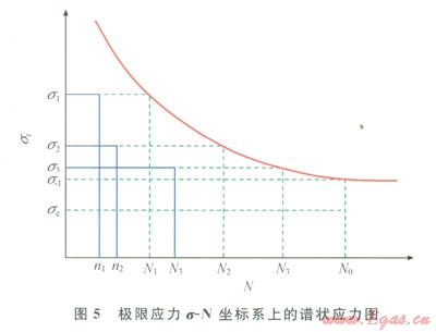 筆者涉及的疲勞破壞就屬于疲勞損傷累積,損傷累積法的理論基礎是Miner法則[8]。Miner法則認為:根據(jù)s-N曲線的定義,在恒定應力幅(s)的作用下,構(gòu)件運轉(zhuǎn)循環(huán)次數(shù)為N時,將產(chǎn)生完全損傷即失效。那么構(gòu)件在應力s作用下運轉(zhuǎn)一個比N次數(shù)小的n時,將產(chǎn)生部分損傷,同時假定在這一過程中每一次損傷相同,則在s的作用下,損傷概率為n/N,如果一個構(gòu)件在包含不同應力(sj),將產(chǎn)生一個不同的損傷率nj/Nj,當這些損傷概率總和達到1時,就可以預測出現(xiàn)失效,也就是說: