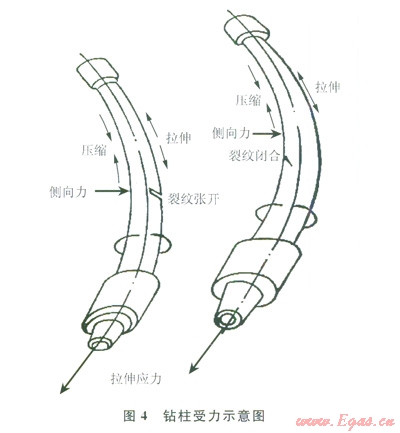 1930年,英國人古德曼(J.Goodman)簡化了疲勞極限的曲線圖[6],根據(jù)他的疲勞理論可以得出,鉆桿的疲勞強度不僅與鉆桿自身的性能有關(guān),而且與其承受的平均應力即拉伸應力有關(guān),拉伸應力越大,鉆桿疲勞所需的最低彎曲應力幅越小,所以井越深、鉆桿越靠近井口,鉆桿就容易發(fā)生疲勞,其受力情況見示意圖4。