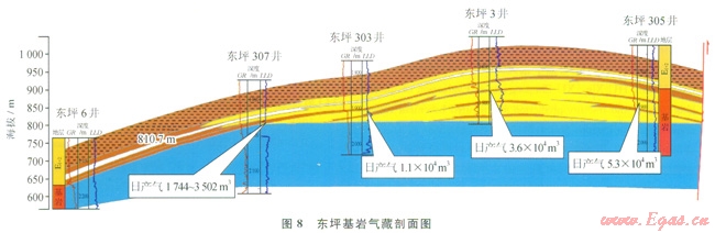 在流體識別、儲層參數(shù)計算、有效厚度確定的基礎上,通過多井對比,對氣藏有如下認識:基巖氣藏為雙重孔隙結構,氣藏內部受裂縫發(fā)育,后期巖脈侵入等影響,縱向及平面上均表現(xiàn)出一定的非均質性,北部的3井區(qū)和南部的l井區(qū)基巖段均為底水塊狀氣藏,基巖氣藏上部和側向與斷層下盤對接的地層為E1+2致密泥巖層及膏巖層,對厚層基巖氣藏起到了很好的封堵作用(圖8)。