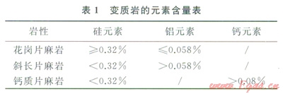 在巖心歸位的基礎上,利用不同巖性的數(shù)據點繪制中子密度交會圖,花崗片麻巖的樣本點落在砂巖線上或其上方,斜長片麻巖的樣本點在白云巖線上,鈣質片麻巖的樣本點在石灰?guī)r線和白云巖線之間。元素俘獲譜測井可以得到地層中主要的元素含量,可用于化學成分不同的變質巖的區(qū)分[6]。花崗片麻巖的石英長石含量高,暗色礦物含量低,因此元素俘獲譜上硅元素含量高,而鋁元素含量低;鈣質片麻巖含有較多的碳酸鹽礦物,因此元素俘獲譜上鈣元素含量高、硅元素含量低;斜長片麻巖含有較多的角閃石等暗色礦物,因此元素俘獲譜上硅元素含量相對低而鋁元素含量相對高,不同巖性的元素含量如表1所示。
