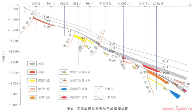 綜上所述,供氣層位及分布范圍、“斷一蓋”遮擋條件及“斷一面”輸導(dǎo)條件的配置關(guān)系,構(gòu)成』,西北緣克拉瑪依—中拐區(qū)不同類型天然氣有序分布的格局(圖6):靠近凹陷一側(cè)的佳木河組上部與油型氣源灶對接形成油型氣藏,下部則接收了來自凹陷中心的煤型氣;