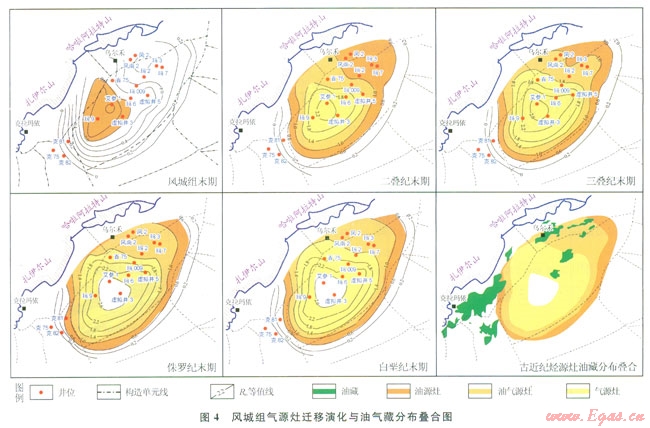 隨著地質(zhì)時間的推移,烴源灶范圍不斷擴大,中心位置也逐漸由油源灶向氣源灶轉(zhuǎn)化。至今,大部分地區(qū)仍在供烴,靠近凹陷邊緣位置的烴源灶以生油為主,靠近凹陷中心位置的烴源灶以生氣為主,凹陷中心由于演化程度過高而不再生成油氣。這樣的烴源灶分布形成了油型氣與原油相伴生、油氣圍繞風(fēng)城組尖滅線環(huán)帶狀分布的特征。