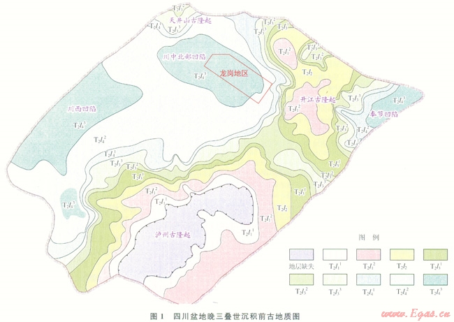 中三疊世末,伴隨著印支運(yùn)動(dòng)的發(fā)生,地臺(tái)整體抬升形成大規(guī)模的海退,上揚(yáng)子地臺(tái)由此結(jié)束了以海相沉積為主的歷史,進(jìn)入以陸相沉積為主的時(shí)期,地層遭受剝蝕。在此過程巾形成了隆起與凹陷,盆地內(nèi)展現(xiàn)為三隆三凹的格局(圖1)。三隆指南側(cè)瀘州古隆起、北側(cè)開江古隆起以及北西邊緣廣元江油附近的天井山古隆起,三凹是指川西凹陷(包括德陽(yáng)—成都—大邑—邛崍—眉山—雅安地區(qū)和樂山—犍為地區(qū))、川中北部凹陷(包括蒼溪—閬中—儀隴地區(qū))和川東北的奉節(jié)凹陷。隆起中心地層遭受剝蝕程度大,瀘州古隆起頂部雷口坡組剝蝕殆盡,開江占隆起殘存雷一段,在凹陷內(nèi)剝蝕程度相對(duì)較弱,均保留了雷四段。