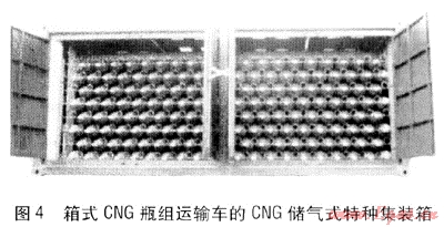 ③ 箱式CNG瓶組運(yùn)輸車由箱式貨車、CNG儲(chǔ)氣式特種集裝箱(見(jiàn)圖4)組成。