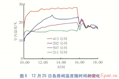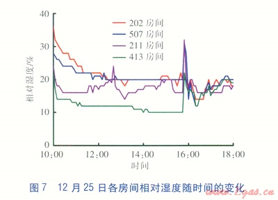 12月25日室內(nèi)溫度從l0:00的15.69℃上升至15:45的28.06℃,之后開始下降。截至18:00,室內(nèi)溫度為16.81℃。房間相對濕度很低,約l0%左右,至l5:50開始相對濕度突然有所增加,并逐步上升到20%。