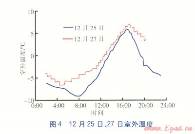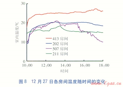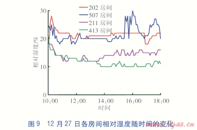 12月27日10:O0室內(nèi)溫度為9.05℃,l3:O0左右溫度持續(xù)在20℃左右,l6:30以后室內(nèi)溫度逐漸下降,l8:00室內(nèi)溫度為18.31℃。相對濕度基本在25%以下。